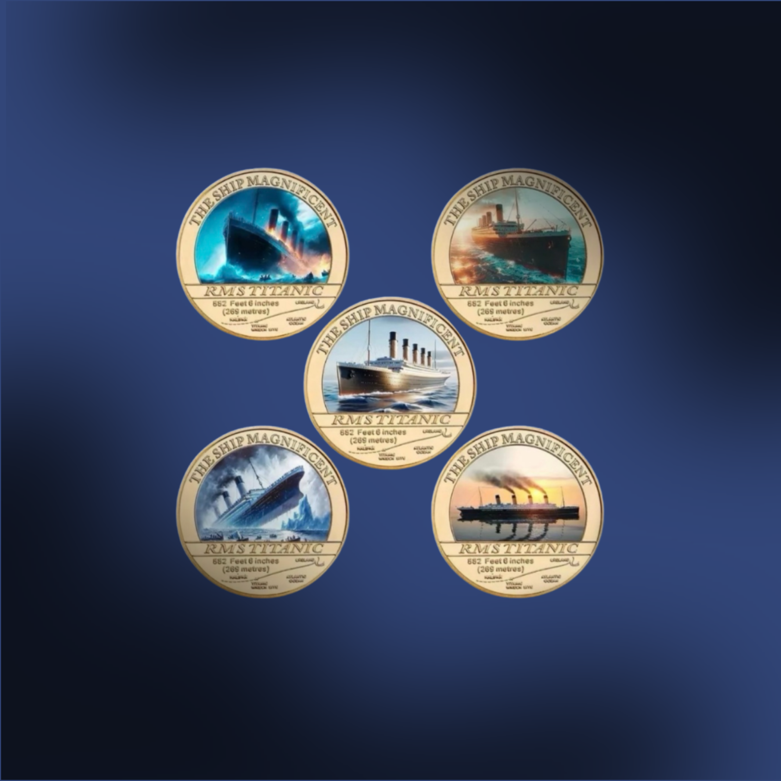 Coffret de pièces commémoratives plaquées or 24K rendant hommage au légendaire Titanic. Un objet de collection raffiné, symbole d’histoire, de prestige et de mémoire.