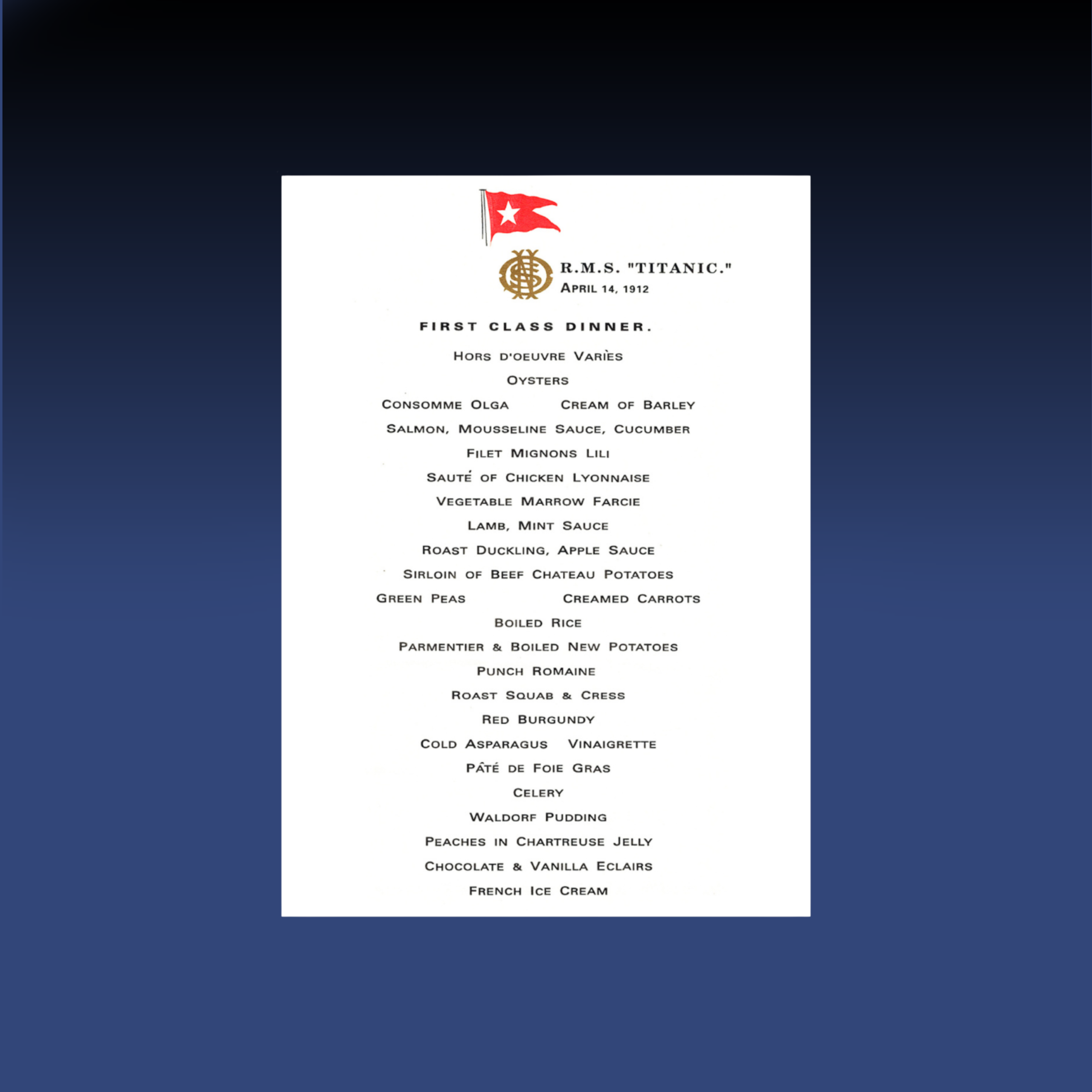 Menu du dîner 1ère classe – RMS Titanic (reproduction historique) Votre avis
