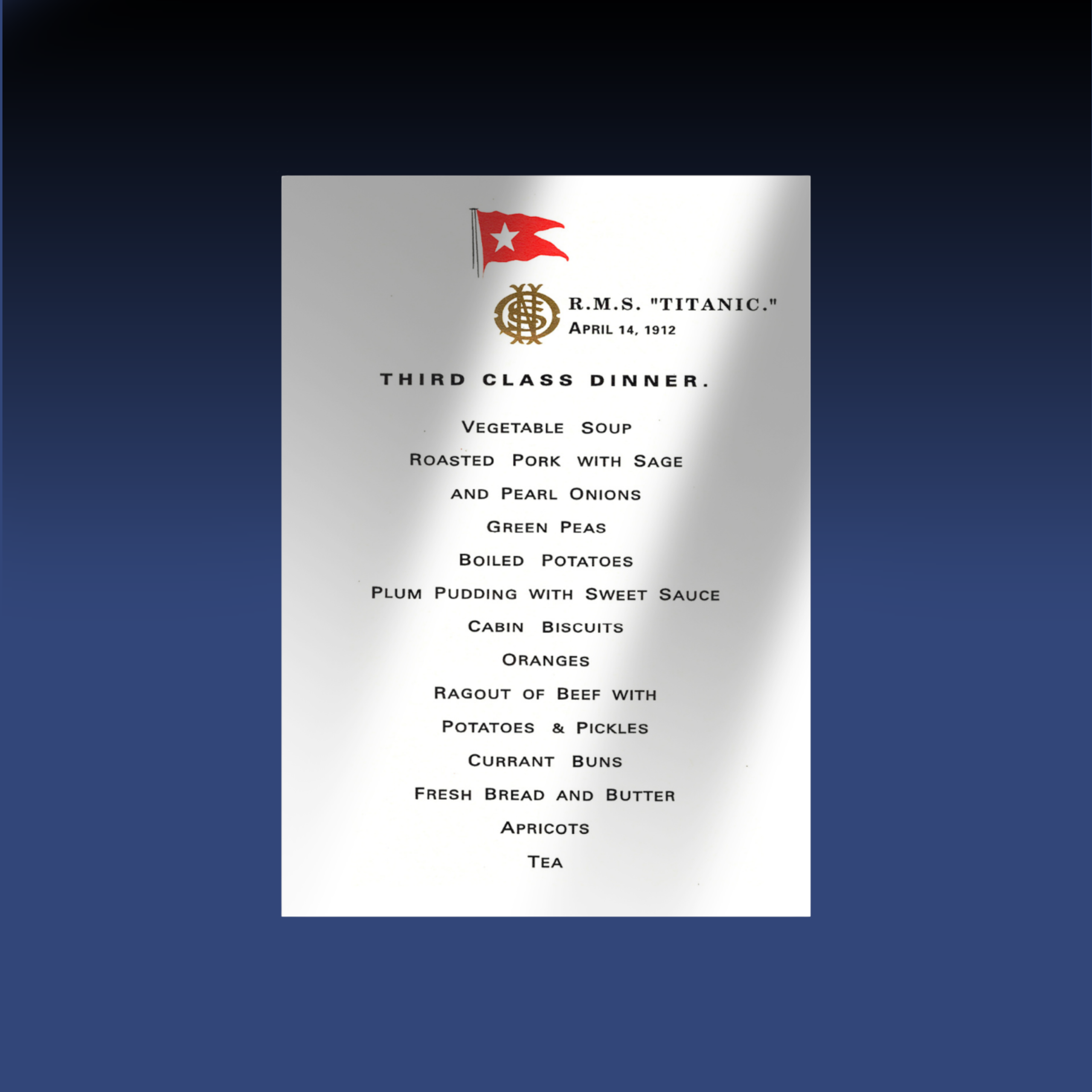 Servi à bord du RMS TITANIC le 14 avril 1912. Ce document historique présente les plats proposés aux passagers de troisième classe et témoigne de la cuisine servie à bord du célèbre paquebot.