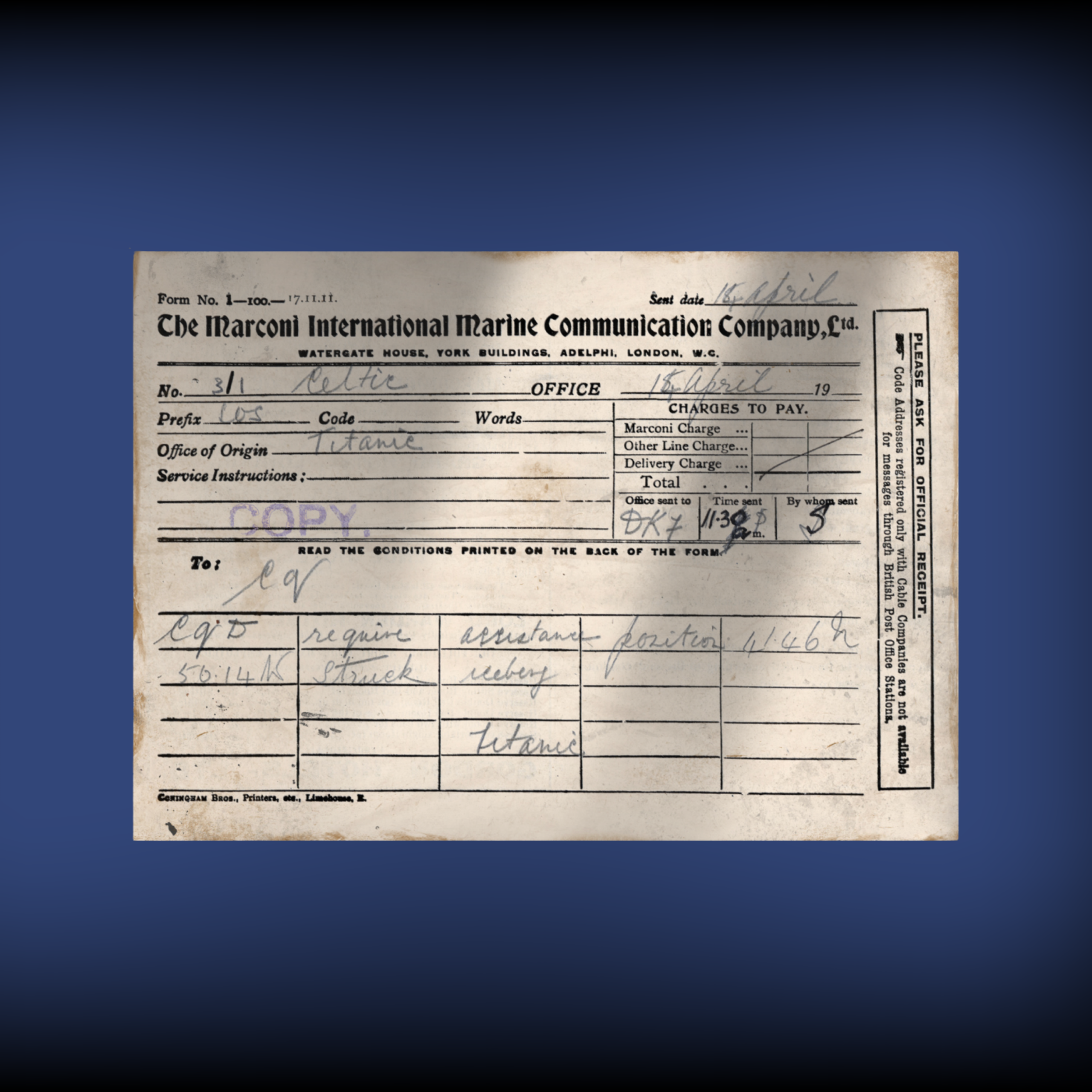 “CQD require assistance. Position 41.46 N 50.14 W. Struck iceberg.”