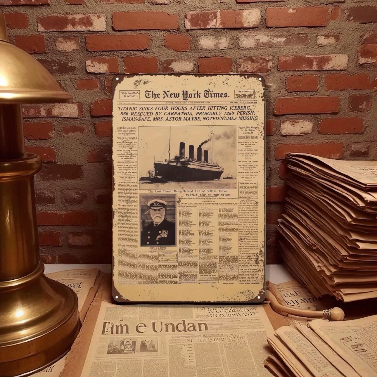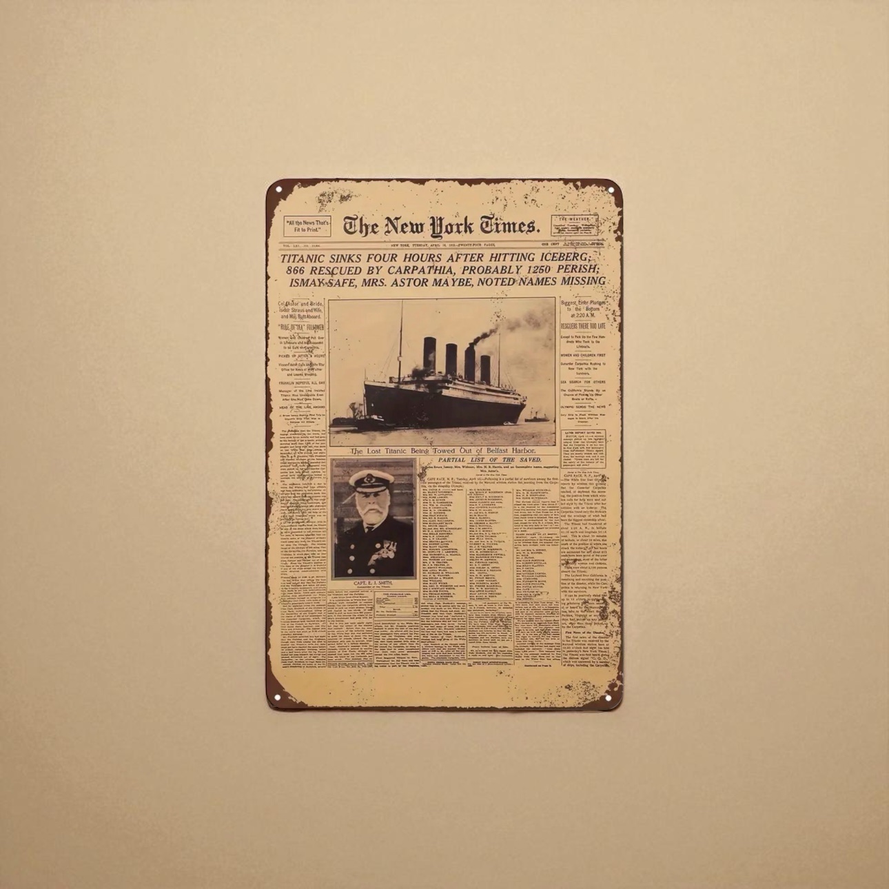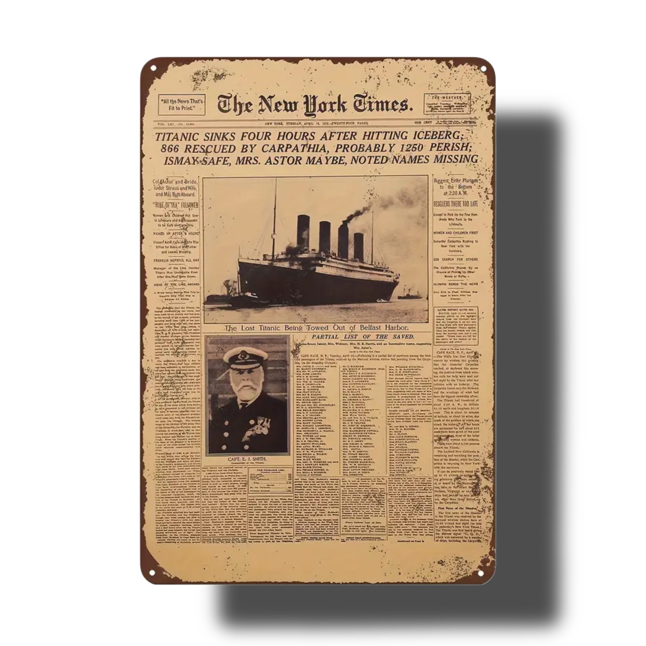 Revivez l’un des moments les plus marquants du XXe siècle avec cette plaque en métal reprenant l’aspect d’une page de journal d’époque annonçant le naufrage du Titanic.