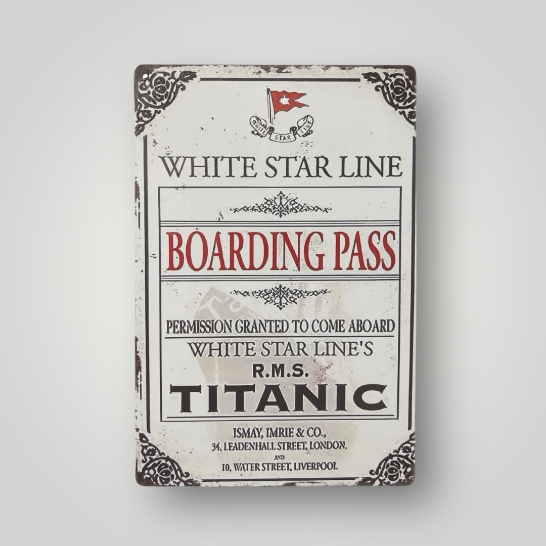 Revivez la légende du plus célèbre paquebot de l’histoire avec cette superbe plaque en métal décorative au style vintage, inspirée de la mythique Boarding Pass de la White Star Line pour le RMS Titanic.